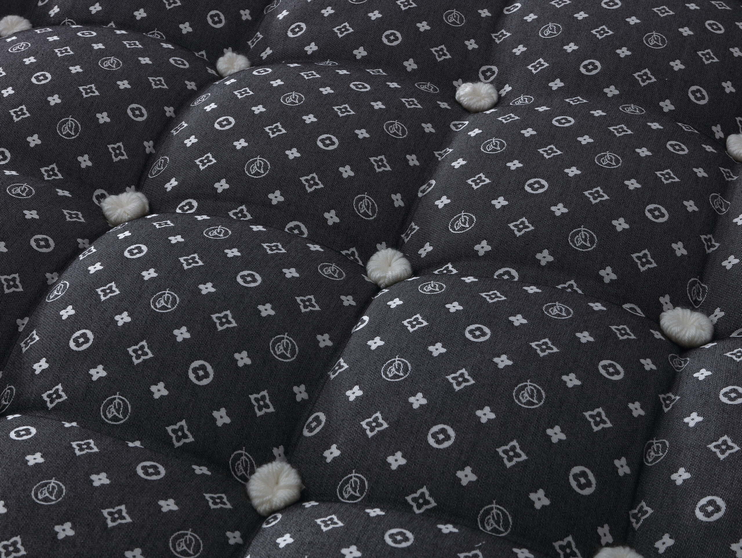 Main color tone: Dark charcoal gray (dark gray/charcoal black) as the base, paired with off-white (milky white/white) floral prints and decorative pom-poms.